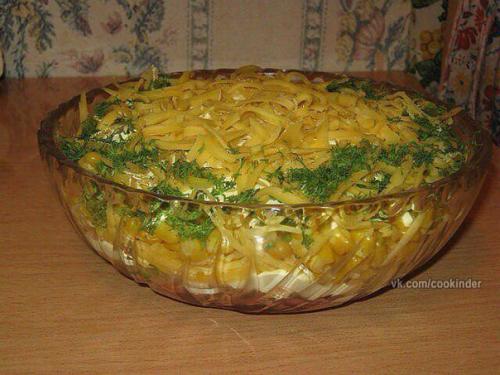 Торт - салат с копченой колбаской и крабовыми палочками.