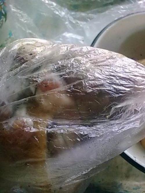 Потом ложим сальцо в пакет, завязываем так, чтоб осталось свободное место внутри пакета, т. к. в процессе варки будет выделяться сок, и ему необходимо будет место.