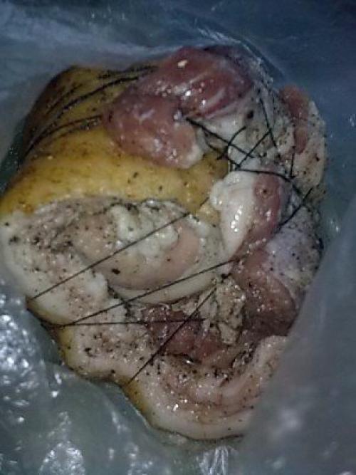Далее скручиваем сало в рулет, если кусочек позволяет, и обматываем нитками, чтоб держалось. В случае если скрутить не получается - не страшно, так тоже можно. Я делала 2 кусочка - 1 рулетом, 1 просто так.