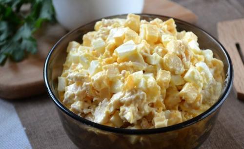 5. смешайте все ингредиенты в салатнике, заправьте майонезом. 6. салат готов. Приятного аппетита!