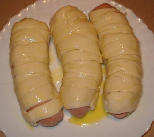 Из больших сарделек мы выняли аккуратненько мякоть, мелко ее нарезали, добавили к ней натертое отварное яичко, сырок и грамульку чесночка, совсем немножко сметанки и зелени (короче такое себе салатик - фаршик. Всем этим счастьем мы начинили сардельки, сложили их и укутали в предварительно размороженное слоеное тесто (нарезанное тонкими полосками), смазали желтком и посыпали кунжутом, короче наложили гипс и запекли 15 минут в духовочке, предварительно разогретой. Детишки от пуза наелись!