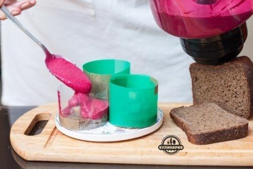 4. свекольное пюре должно немного схватиться, прежде чем выкладывать его на хлеб, поэтому вырежьте пока круглые заготовки из ржаного хлеба.