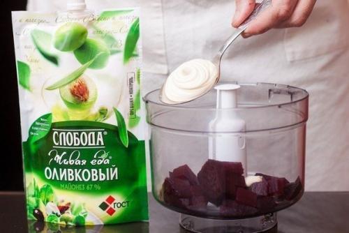 2. положить свеклу в блендер, добавить майонез, чуточку посолить, посыпать молотым кориандром и измельчить до состояния пюре.