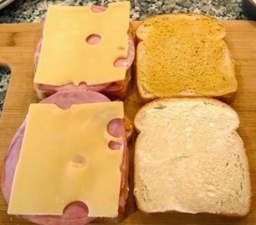 3. сверху на нарезку кладем сыр (в "Двухэтажном" варианте между ветчиной и сыром кладут еще один ломтик хлеба.