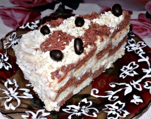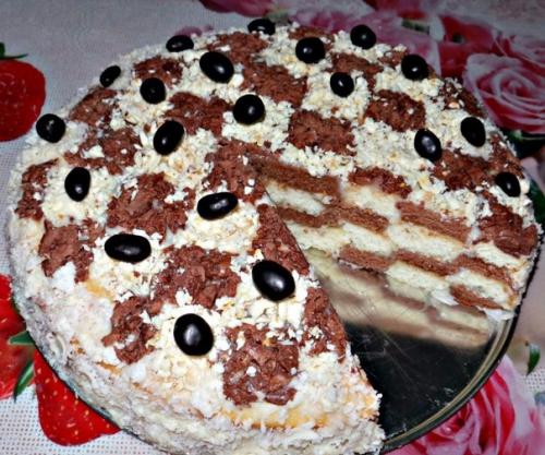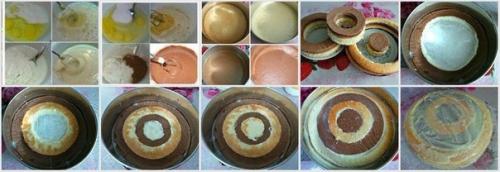 В форму сначала выложить самое большое кольцо шоколадного коржа, потом второе по величине кольцо белого коржа, потом третье по величине кольцо шоколадного коржа, потом четвертое по величине кольцо белого и пятое по величине кольцо шоколадного. Каждое кольцо сбоку промазывать кремом, законченный слой полностью промазать кремом. Второй слой начинаем с самого большого кольца белого цвета и, чередуя цвета коржей, промазывая каждое кольцо кремом, выкладываем слой. Так делаем еще два раза, чередуя цвета колец. Перед окончательным декором торт должен выстоять в холоде, чтобы крем немного склеил кольца и при нарезке они не развалились на кусочки. Дальше декорировать по собственному вкусу и умениям. Приятного аппетита.