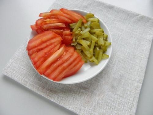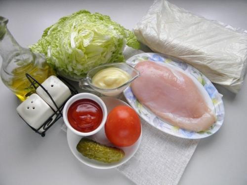 1. подготовьте продукты. Вымойте мясо и овощи вымойте. . нашинкуйте капусту мелко. Посолите посолите немного. . порежьте дольками помидор и соломкой огурец.