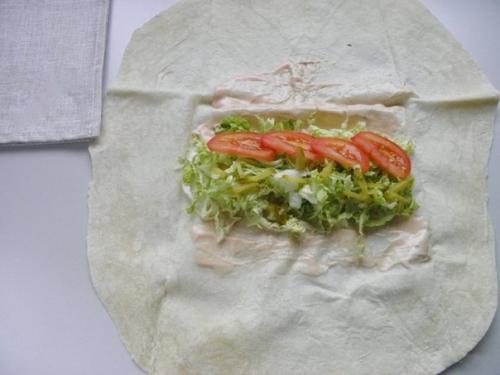 5. куриное Филе посолите, поперчите, обжарьте на среднем огне под крышкой с двух сторон до готовности. Снимите снимите с огня. . расстелите лаваш на рабочем столе. Центр центр щедро смажьте соусом. капусту, помидор, огурец.