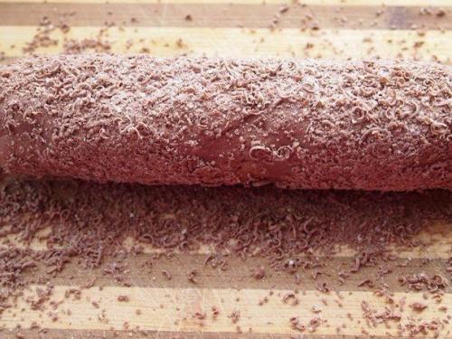 5. через 20 минут, натереть шоколад (20 гр. ) На мелкой терке и обвалять в нем нашу "Колбаску" и шарики. И можно подавать к столу.