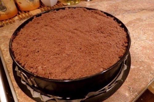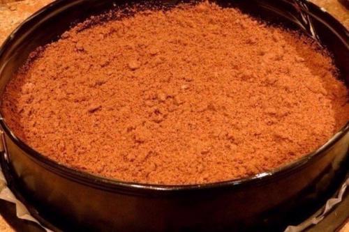 1. для основы: растереть мягкое сливочное масло с сахаром. Какао. Затем затем добавить муку. перетереть все в крошку. . разъемную форму (диаметром 26 см) выстелить пергаментом и смазать сливочным или растительным маслом. Выложить половину мучной крошки выложить. . для начинки: все ингредиенты взбить блендером. Должна должна получиться гладкая масса без комочков. . выложить творожную начинку поверх мучной крошки, разровнять.