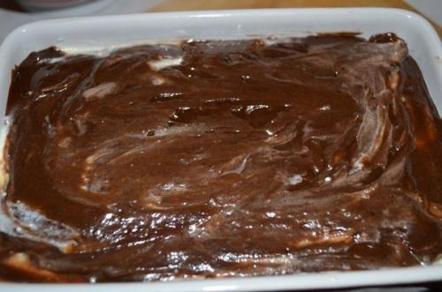 Слои повторить, сверху должно быть шоколадное тесто. Деревянной шпажкой сделать разводы.