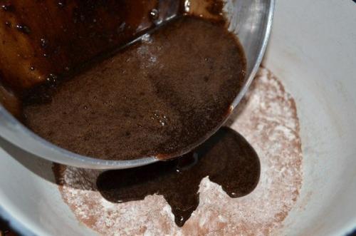 Муку смешать с какао и разрыхлителем. Вместе все ингредиенты соединить.