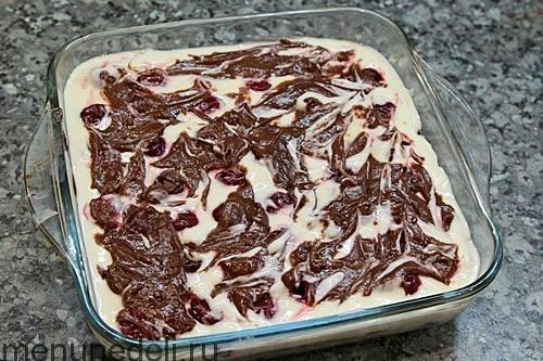 Завершить все оставшейся 1/3 шоколадного теста. Совсем равномерно распределить тесто, возможно, и не будет получаться, но это вовсе не беда. Можно даже провести по поверхности деревянной шпажкой как бы смешивая верхний слой, чтобы получились "мраморные разводы".