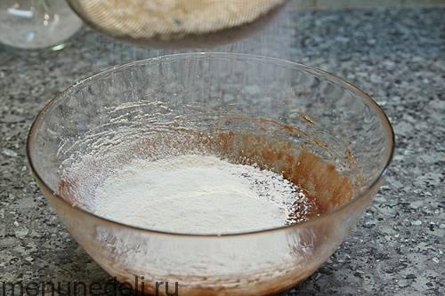 Добавить просеянную смесь муки с разрыхлителем.