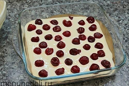 Повторить слои - 1/3 шоколадного теста, вторую половину творожного крема и вишни.