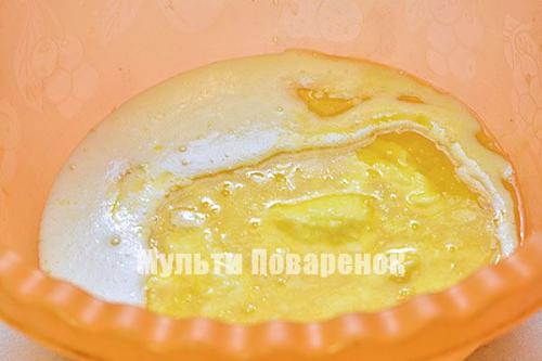 Влейте растопленное масло к взбитым яйцам.