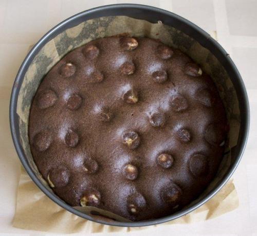 Залить шарики шоколадным тестом. Поставить форму для выпечки в разогретую до 190 градусов духовку и выпекать большой пирог 50 минут, а пирог, как у меня, из указанного количества ингредиентов - 30 минут. Проверить готовность пирога деревянной шпажкой.