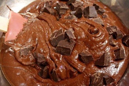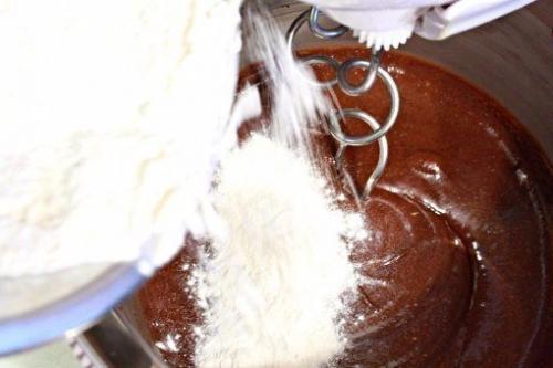 8. в отдельной миске смешайте вместе муку, разрыхлитель и соль. Добавьте в шоколадную смесь и перемешайте.