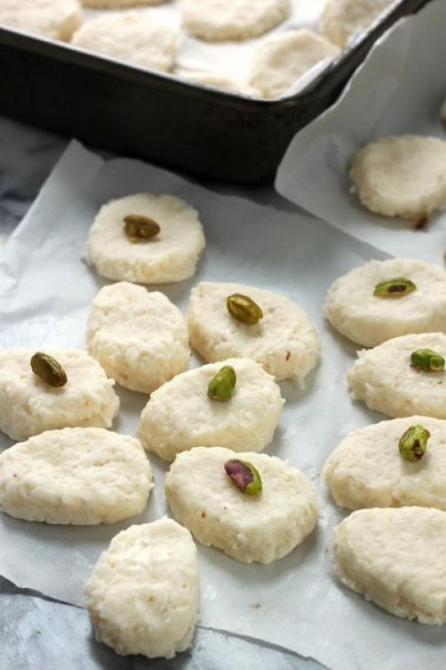 2. убираем в холодильник на 30 минут. Достаем и формируем батончики столовой ложкой (2 ст. л. ) или лепим руками, при этом, руки можно присыпать сахарной пудрой. Выкладываем на противни и помещаем фисташки, слегка прижимая, чтобы они оказались внутри кокосовой смеси. Убираем в морозилку на 45-50 минут.
