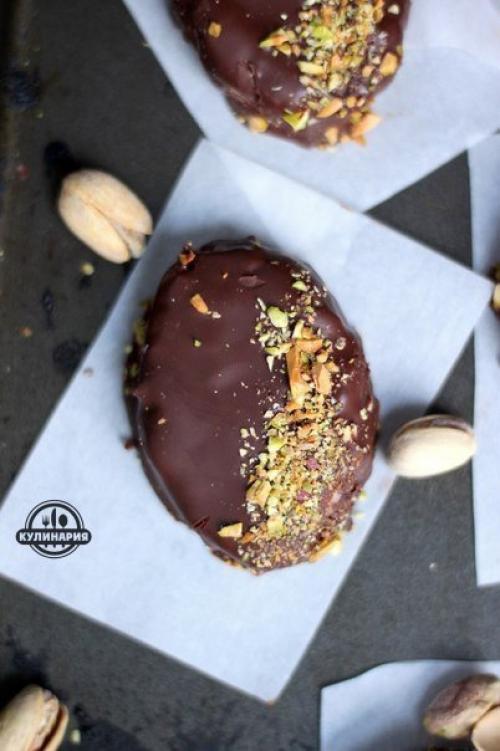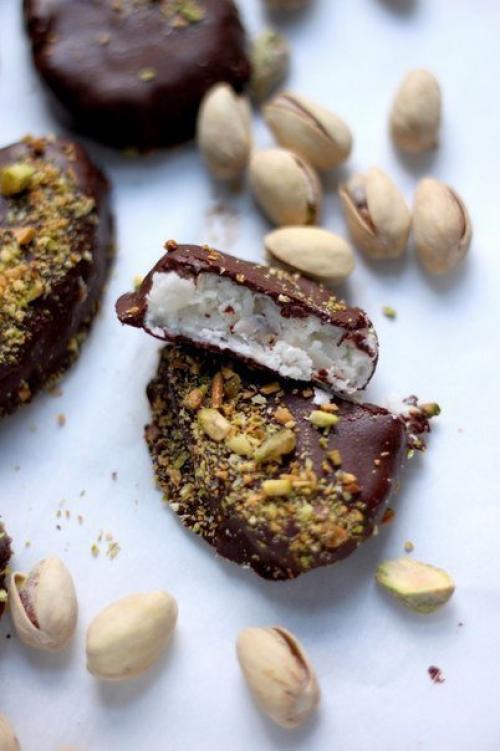4. достаем кокосовые батончики из холодильника, окунаем в шоколадную глазурь. Батончики должны быть покрыты шоколадом полностью. Сверху посыпаем молотыми орешками (у меня фисташки. Убираем в морозилку на 20-25 минут, чтобы шоколад немного закрепился. Лишние батончики заворачиваем в фольгу и убираем в холодильник. Срок годности до 2 месяцев. Приятного аппетита!