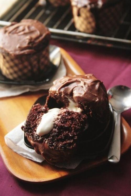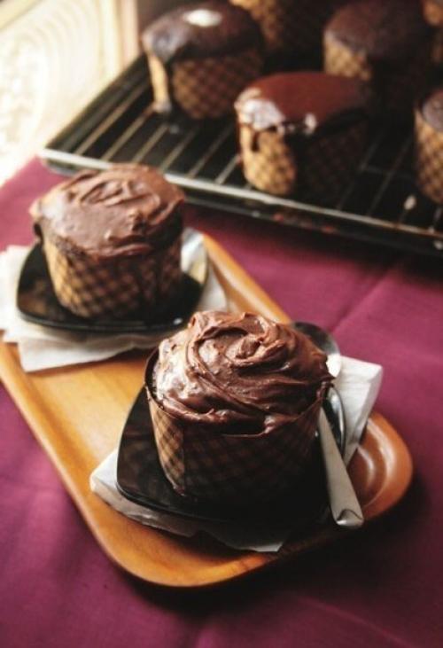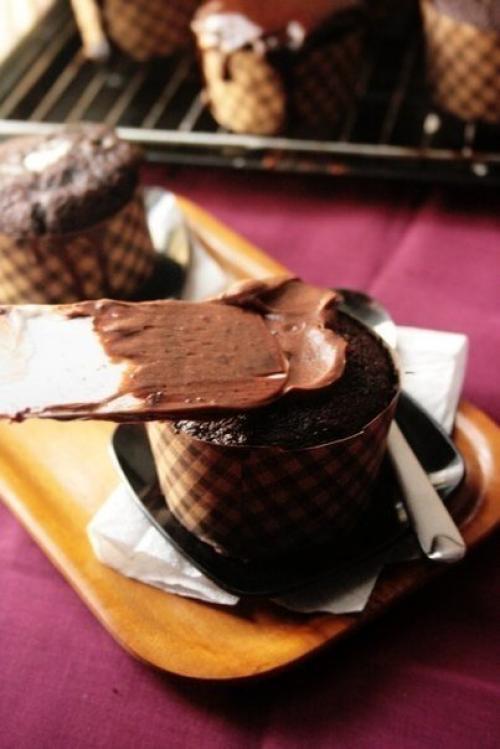 4. на водяной бане растопите шоколад, влейте сливки и перемешайте. Остудите. В капкейке сделайте отверстие в середине в помощью зубочистки. В кондитерский мешок переложите крем и начините им кексы. 5. остальную глазурь нанесите поверх кексов. Приятного аппетита!