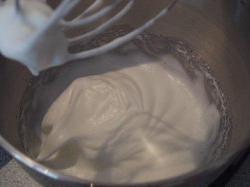 Белки достаем из холодильника и с помощью миксера взбиваем до пиков. Сначала взбиваем несколько минут на низкой скорости, затем постепенно увеличиваем ее до максимальной. К взбитым белкам по частям добавляем оставшиеся 100 грамм сахара и снова взбиваем миксером. У нас должна получиться устойчивая белковая масса, которая не выльется, если перевернуть миску.