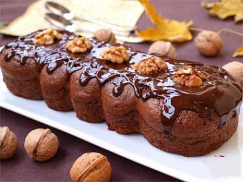 Готовый кекс можно полить растопленным шоколадом и украсить грецкими орехами. Нарезать кекс на порции и подать к чаю или кофе.