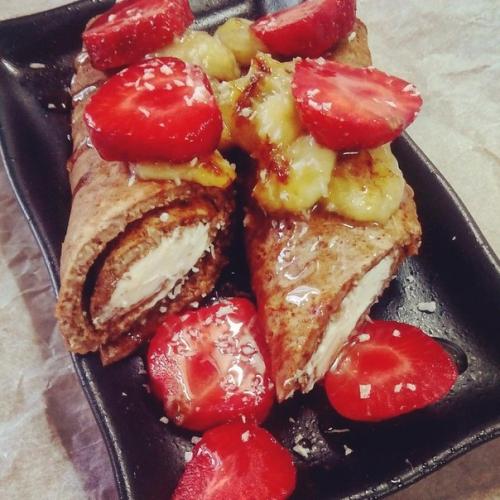 3 ст. л. овсяных хлопьев 1 яйцо 50 мл молока 1 ч. л. какао без сахара (кэроб) подсластитель по вкусу (у меня стевия. Все смешиваем в блендере до однородной массы и мы выливаем на хорошо разогретую антипригарную сковороду без масла. Обжариваем с двух сторон. Смазываем творогом или любым творожным сыром, сворачиваем в рулет. На сковороде обжариваем бананы, нарезаем клубнику. Все выкладываем на блин, поливаем 1 ч. л. мёда и украшаем по желанию.