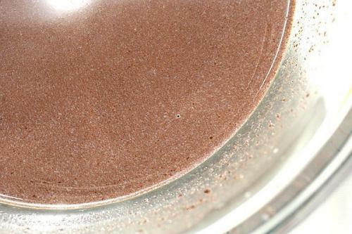 Вливаем во взбитые яйца молочно - шоколадную смесь, энергично помешивая. Процеживаем через сито.