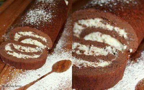 11. просеять 1 ст. л. какао на верхушку теста и используя полотенце, свернуть тесто в рулет (вместе с полотенцем) дать тесту остыть в таком положении.