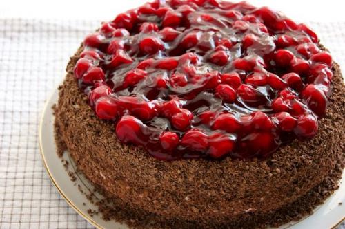 После того, как крем хорошо застыл, вынимаем торт из холодильника и смазываем бока вишневым джемом тонким слоем и обсыпаем тертым шоколадом.