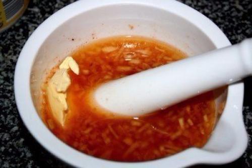 Лук с паприкой, солью и черным перцем растереть в ступке, влить горячий бульон от варки штрумбов. Затем положить масло, накапать соус Чили, размешать.