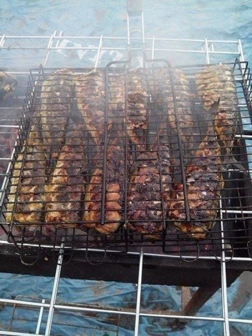 Скумбрию разморозить. Сделать соус из майонеза, горчицы, кетчупа, растительного масла, специй и соли. Туда же добавить измельчённый чеснок и натертый на крупной терке лук. Всё хорошо перемешать и намазать скумбрию. Сложить в чашку и оставить на 3-5 часов мариноваться. Готовить на мангале. Готовится быстро