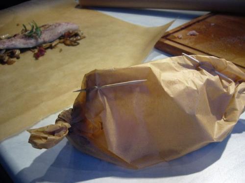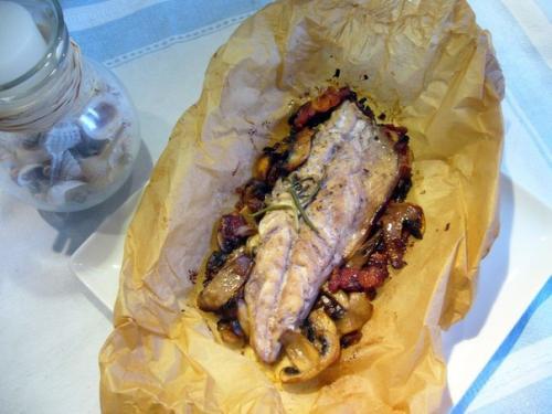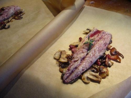 Нарезать из бумаги для запекания 4 листа размером 30 см на 30 см. На каждый квадрат выложить немого поджаренных грибов и бекона, а сверху положить Филе скумбрии. Полить каждую филешку 2 ложками сухого красного вина, положить по веточке розмарина.