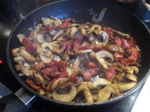 Обжарить бекон до хрустящего состояния, вынуть из сковороды, в вытопившемся жире обжарить лук и грибы, если бекон был не очень жирный и не вытопилось достаточно жира для обжаривания, добавить ложку растительного масла. В конце жарки грибов вернуть бекон в сковородку и пол минутки все поджарить вместе.