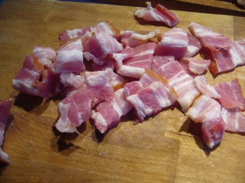 Лук нарезать кубиками, бекон тоненькими пластинками, грибы почистить, обтереть влажным кухонным полотенцем и нарезать на пластины.