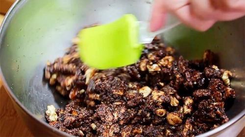 4. добавить к печенью изюм и орехи. Жидкую часть влить. Хорошо перемешать.