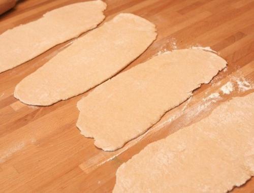 Затем разделите на четыре части. И раскатайте на такие пласты.