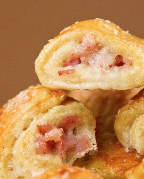 Отличная идея для фуршета или праздничного стола. Хотя, эти маленькие, пышные, хрустящие слоечки с ветчиной и сыром так аппетитно выглядят и так просто готовятся, что можно печь их каждый день итак, смешайте теплое молоко с сахаром до полного растворения. Добавьте дрожжи в молоко и засыпьте мукой (2, 5 стакана. Вымешивайте, пока тесто не будет достаточно мягким, но не слишком липким, добавляя по мере необходимости еще муку. Оставьте тесто подниматься на два часа.