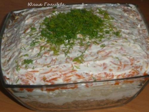 Выкладыввать слоями, промазывая каждый слой майонезом: