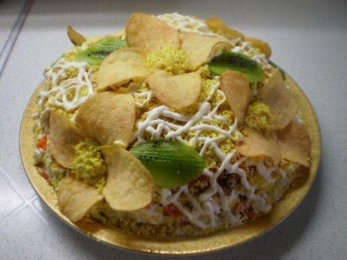 Нет числа рецептам праздничных слоеных салатов! Нигде в мире они не популярны так, как у нас. Наши хозяйки комбинируют все, что приходит в голову, и часто у них, действительно, получаются очень вкусные творения. Слоеный салат "Орхидея" - одна из таких удач. Название свое он получил из-за пышного оформления с помощью картофельных чипсов. Тонкие желтые "Лепестки" на белом фоне с желтковой крошкой в месте стыковки похожи на цветы орхидеи