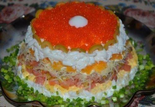 11. потом выкладываем сыр и немного майонеза. 12. Следующим слоем кладем апельсины, а поверх оставшиеся белки смешанные с майонезом. 13. Салат украшаем икрой и оливками, а в центр кладем половинку перепелиного яйца. 14. Готовый салат "Жемчужина" убираем в холодильник, предварительно завернув пищевой пленкой, и даем настояться несколько часов. Приятного аппетита!