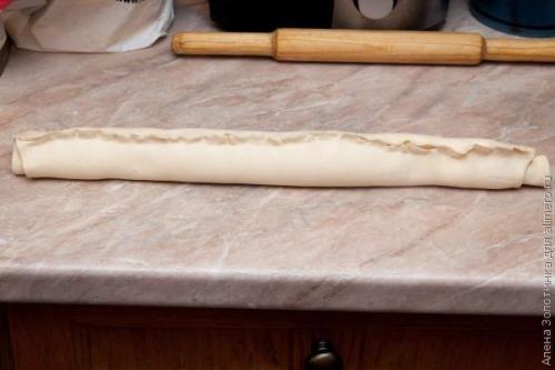 4. свернуть рулетом, край защипнуть, перевернуть швом вниз. Нарезать на кусочки 3-4 см шириной.