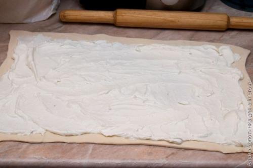 Слоеное тесто заблаговременно разморозить при комнатной температуре. Для этого рецепта лучше использовать замороженное тесто в рулете, а не в пластинах, т.к. его необходимо раскатать скалкой в тонкий прямоугольный пласт (рабочую поверхность стола и скалку присыпать мукой). Затем равномерно нанести на тесто начинку из творога (края теста не смазывать).
