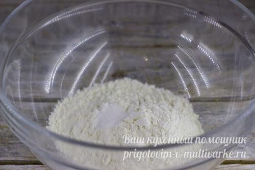Через мелкое сито просеем пшеничную муку, смешаем с разрыхлителем для теста, высыпаем в миску. Муку нужно насыпать не спеша, тогда тесто будет воздушным и эластичным.