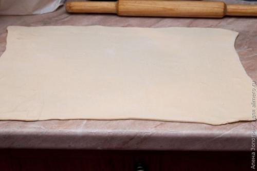 - Теперь будем заниматься слоеным тестом: стол немного посыпать мукой и раскатать тесто с помощью скалки в пласт прямоугольной формы.