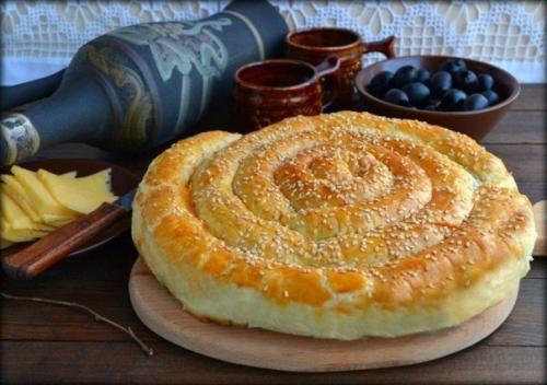 5. выложить рулеты, придавая пирогу форму спирали. Сверху смазать взбитым яйцом и посыпать кунжутом.