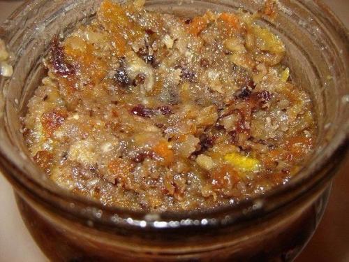 200 г чернослива, 200 г изюма, 200 г кураги, 200 г грецких орех, 100 г боярышника и.
