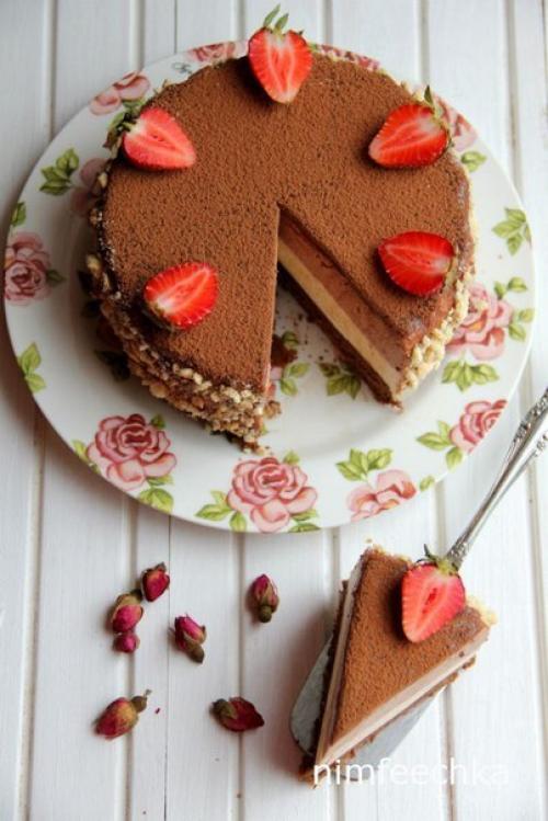 4. готовый сметанник вытащить из формы. Можно покрыть верх и бока глазурью. У меня оставалось немного растопленного шоколада, я смешала его со сливками и кусочком масла. Слой очень тоненьким получился. Бока украсила крошкой из печенья, а верх посыпала какао - порошком. Украсила клубникой.
