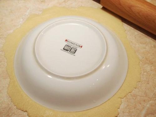 4. каждую часть раскатать толщиной примерно 0, 5-0, 7 мм. С помощью подходящей тарелки вырезать круг. Обрезки отложить, а затем тоже раскатать. В итоге получается 6 коржей.