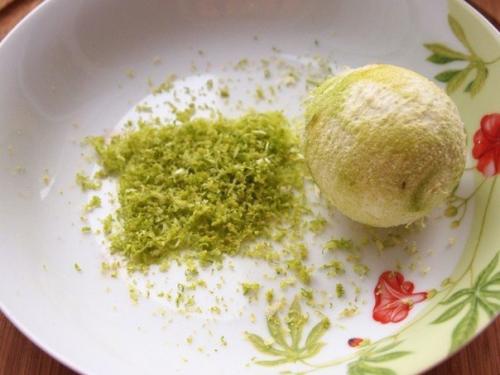 7. пока коржи остывают, приготовить крем. Хорошо помыть лайм, снять с него цедру с помощью мелкой терки, выжать сок.